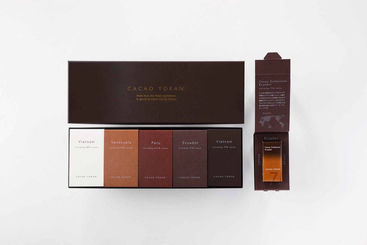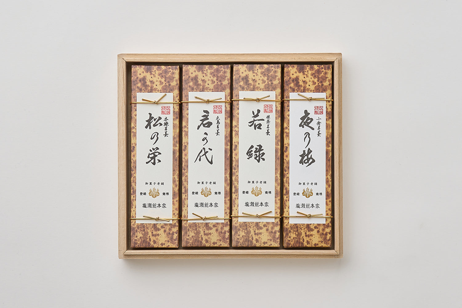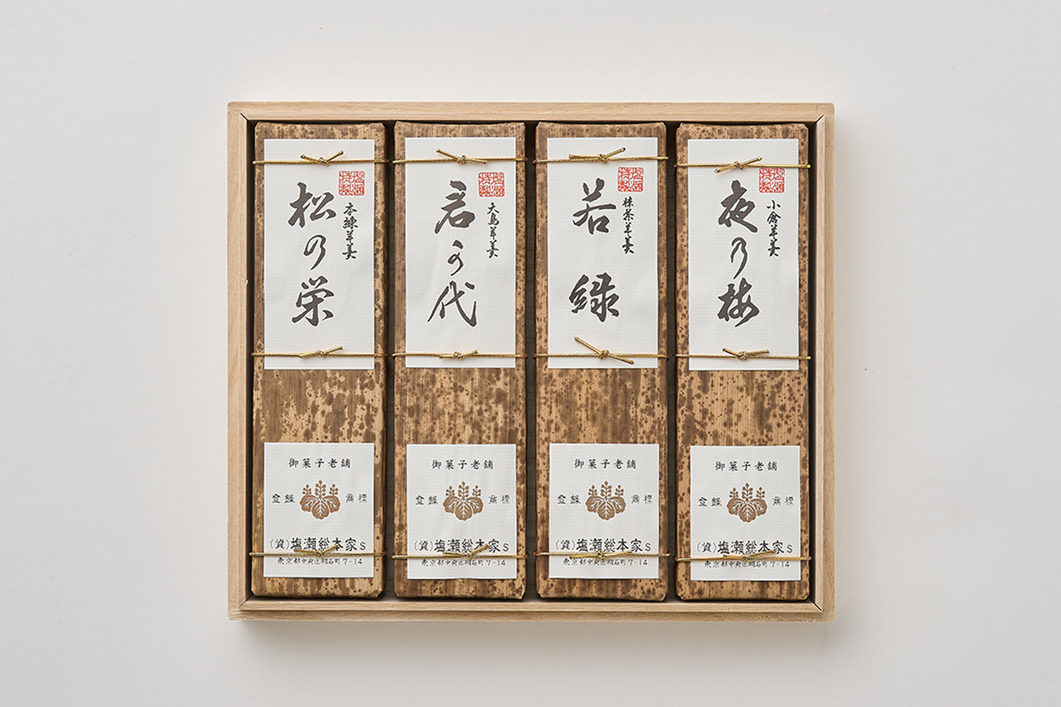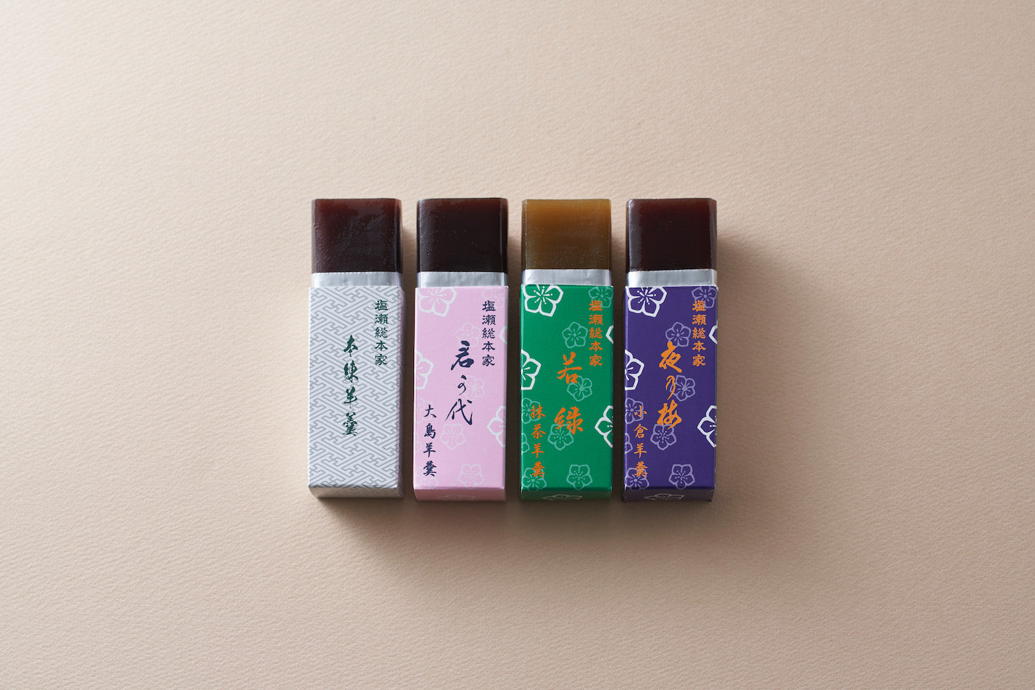 江戸時代より塩瀬に存在し昭憲皇太后にも絶賛された夜の梅に始まり、本練り、抹茶、黒糖、栗の5種類のお味をお楽しみください。一口サイズの小型「姫羊羹」、スタンダードな「中型羊羹」、竹皮に包まれご贈答として最適な大型「特製羊羹」まで各種大きさを取り揃えております。