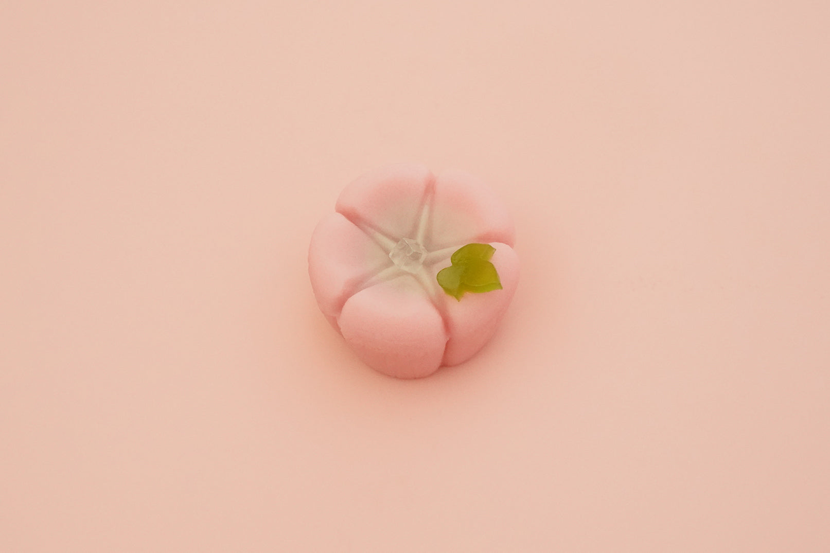 塩瀬では露を透明な錦玉で表現。朝咲いた新鮮ですがすがしい様を、上生菓子として表現しています。